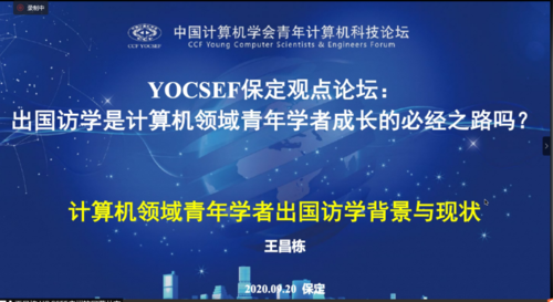 2020年9月20日上午,中国计算机学会青年计算机科技论坛(CCF YOCSEF)保定学术委员会举办题为“出国访学是计算机领域青年学者成长的必经之路吗?”的观点论坛,本次活动采用线上线下混合,中昊翔保定医疗器械物流有限公司协办。论坛由YOCSEF保定AC委员、华北电力大学赵振兵博士及YOCSEF保定AC委员、河北大学刘帅奇博士共同担任执行主席,微论坛执行主席为CCF YOCSEF保定AC委员、河北农业大学副教授张玉新和CCF YOCSEF保定AC委员、河北科技学院副教授方艳辉。论坛邀请了YOCSEF广州主席、CCF广州分部副主席、中山大学王昌栋博士,YOCSEF总部AC委员、天津理工大学罗训教授和北京理工大学计算机学院博士生导师李长升教授作引导性发言。同时,在思辨环节还邀请了美国奥马哈价值投资教育与研究中心中国区代表徐攀、河北农业大学信息科学与技术学院博士生导师刘博副教授和华北电力大学博士生导师韩东升副教授共同参与思辨讨论。在六位受邀嘉宾中,王昌栋、罗训、徐攀有出国访学经历,李长升、刘博、韩东升没有出国访学经历。YOCSEF保定AC委员、委员以及全国各地分论坛AC委员,来自全国各高校、企业或事业单位的代表共130余人在会场或线上参加了本次论坛。