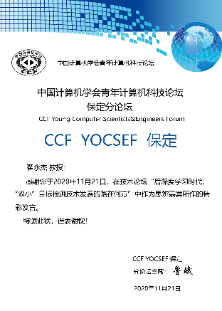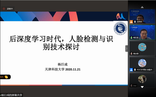 2020年11月21日上午,由中国计算机学会(CCF)-主办的青年计算机科技论坛(YOCSEF)保定分论坛“后深度学习时代,‘双小’目标检测技术发展的路在何方?”成功举办,论坛执行主席为CCF YOCSEF保定AC委员、华北电力大学副教授赵振兵和CCF YOCSEF保定AC委员、河北大学副教授刘帅奇,微论坛执行主席为YOCSEF保定AC委员、河北大学工商学院丛帅主任和YOCSEF保定委员、华北电力大学副教授贾惠彬。本次论坛邀请南开大学程明明教授、南京理工大学魏秀参教授、天津科技大学杨巨成教授作为引导报告嘉宾;邀请华北电力大学翟永杰教授、河北农业大学刘博副教授、河北大学刘晓光副教授和中国电力科学研究院人工智能应用研究所谈元鹏博士作为思辨嘉宾。论坛主要通过腾讯会议邀请观众参与活动,并在微信群中同步直播。活动吸引了超过580人加入微信群参与讨论,超过180人通过腾讯会议观看直播并参与讨论,参会人员中不仅有全国各地分论坛AC委员和来自高校、企业的青年学者及科研人员,还有不少对该领域感兴趣的学生和相关从业人员。论坛开展时,线上会议观众通过“举手”发言和打字聊天的方式积极互动讨论,现场气氛活跃,直到论坛结束后,不少观众仍在微信群中与嘉宾相互交流。
