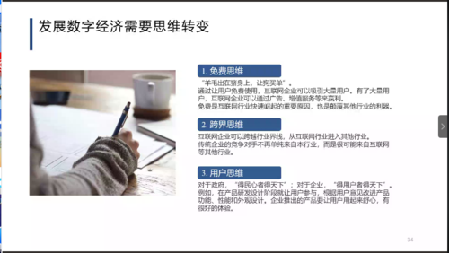 首先,葛建新博士以《数字经济引领高质量发展》为题,分四个方面展开。首先介绍了数字经济及其基本特征,数字素养及其对劳动者和消费者的新要求等基本概念、我国数字经济的发展历程以及数字经济新业态、新模式。葛建新博士还提到产业数字化和数字产业化相互促进引领高质量发展,强调了发展数字经济需要思维转变,包括免费思维、跨界思维、用户思维、社会化思维、大数据思维、平台思维、简约思维等。