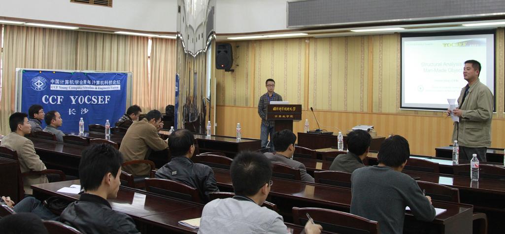 2011年11月26日下午2点30分开始,CCF YOCSEF长沙在国防科学技术大学计算机学院学术厅举行了 “可视计算STAR”研讨会。本次研讨会由YOCSEF长沙前主席董威、学术秘书实英和YOCSEF积极人士志全共同执行。与会者有来自国防科技大学的AC委员李暾,中南大学的委员赵颖,湖南大学的委员光华等,还有来自国防科学技术大学、湖南大学、中南大学和湖南师范大学等湖南各高校的YOCSEF积极人士李宝、衡越、陈寅、彦臻、春鸣、华伟、树林、圣军、胜辉、佳志、家巨和湘宾等老师以及几十位学生参加了会议。国防科技大学“国家一级教授”金士尧教授于百忙之中出席了会议。