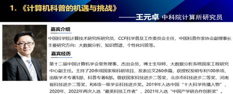 随后是论坛正式环节,第一阶段是引导发言环节。第一位引导发言嘉宾是中科院计算所研究员、CCF科普工委主任王元卓。他分享了计算机科普的机遇与挑战。王元卓结合自己的经历提出计算机领域的科普有其独特的特点:受众很广,科普很难,内容要求高。人工智能技术为科普带来了很大的机遇和新的技术手段,但如何让人工智能热点技术作系统化的输出是一个难点。最后提出计算机科普的三个方向:基于热点进行专业科普创作、基于不同的受众创作不同的科普内容,将计算机技术应用到科普创作。