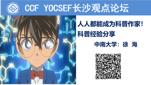 徐海分享了自己结合《名侦探柯南》、歌曲中的科学密码等创新方式开展科普工作的成功经验,指出结合大众喜闻乐见的娱乐活动做科普,有望实现“科学界、科普界、青年少、家长、娱乐歌星、电视台、广电总局”等多方共赢的局面,因为“娱乐给科学流量,科学给娱乐正能量”。最后,徐海提出“人人都能成为科普作家”,呼吁更多科技工作者积极参与科普、为科普贡献力量。