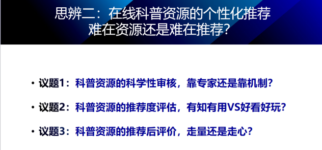 思辨二着重探讨在线科普资源的个性化推荐问题。嘉宾及与会者就资源和推荐两方面展开了深入的讨论。徐海首先指出科普资源很丰富,但质量参差不齐,因此推荐高质量内容颇具挑战性。他认为,建立一个高效的科普视频内容审核机制尤为重要。他提到了科普中国、搜狐视频等平台,它们选择了高水平的科普专家和权威内容,对科普质量有一定保障。同时他进一步建议通过科学管理部门审核和认证一些质量优秀的科普大V,以便受众找到可信赖的信息来源。范雄伟认为AI推荐的内容可能会偏向用户已有的喜好,从而导致观点偏差,这就需要平衡推荐的内容与用户的真实需求。他强调了科普专家存在专业边界,不同年龄层次的受众有不同的需求和接受能力。