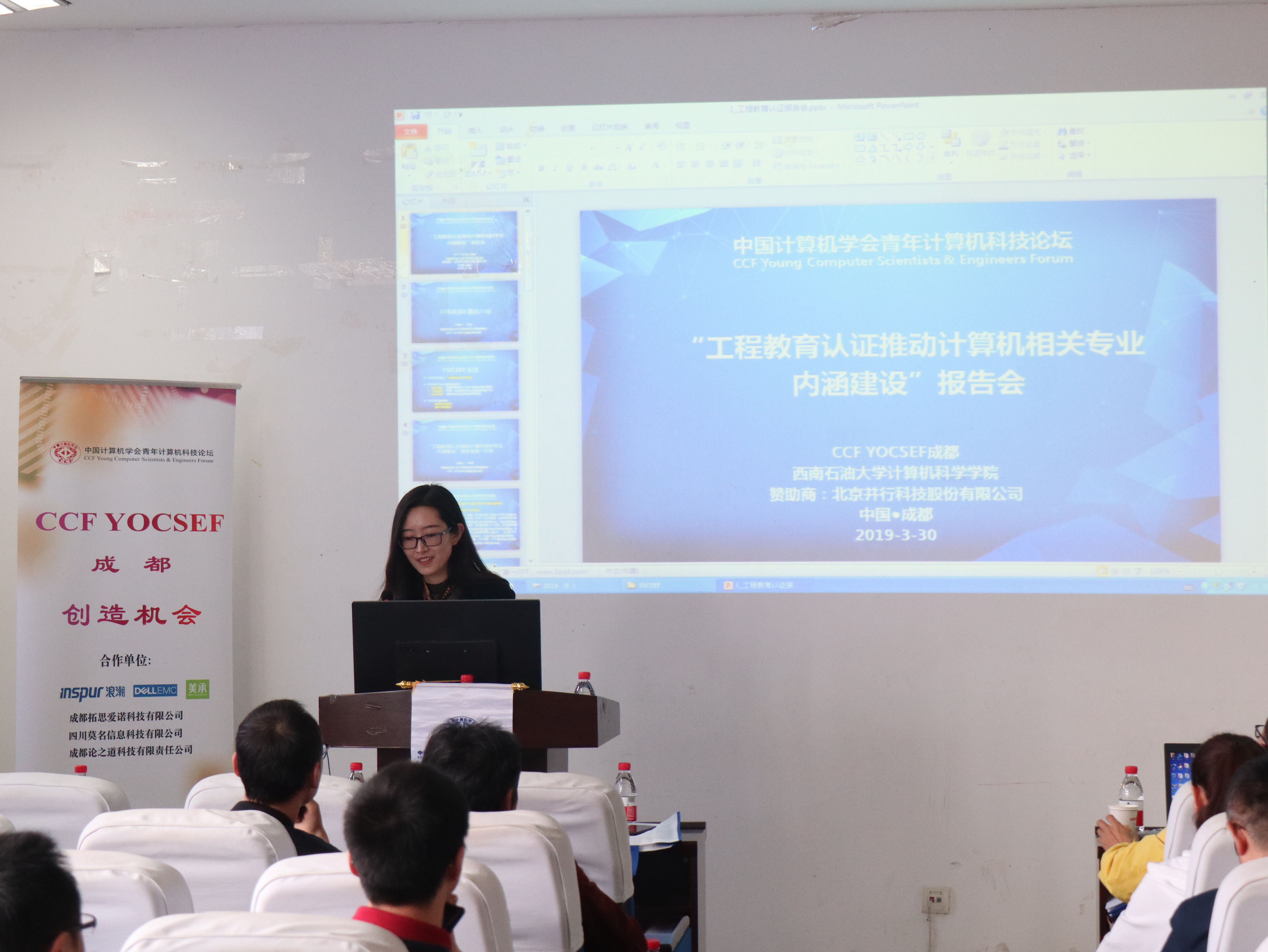 2019年3月30日下午14:00-18:00,CCF YOCSEF成都在西南石油大学计算机科学学院明理楼成功举办了“工程教育认证推动计算机相关专业内涵建设”学术报告会。YOCSEF成都荣誉委员、AC委员和YOCSEF保定分论坛主席、河北大学杨晓晖教授参加了报告会,以及来自四川、重庆、贵州等10余所高校和多家科技企业共90多名代表参加。本次报告会的执行主席是YOCSEF成都副主席王杨和段磊,赞助商是北京并行科技有限股份公司。