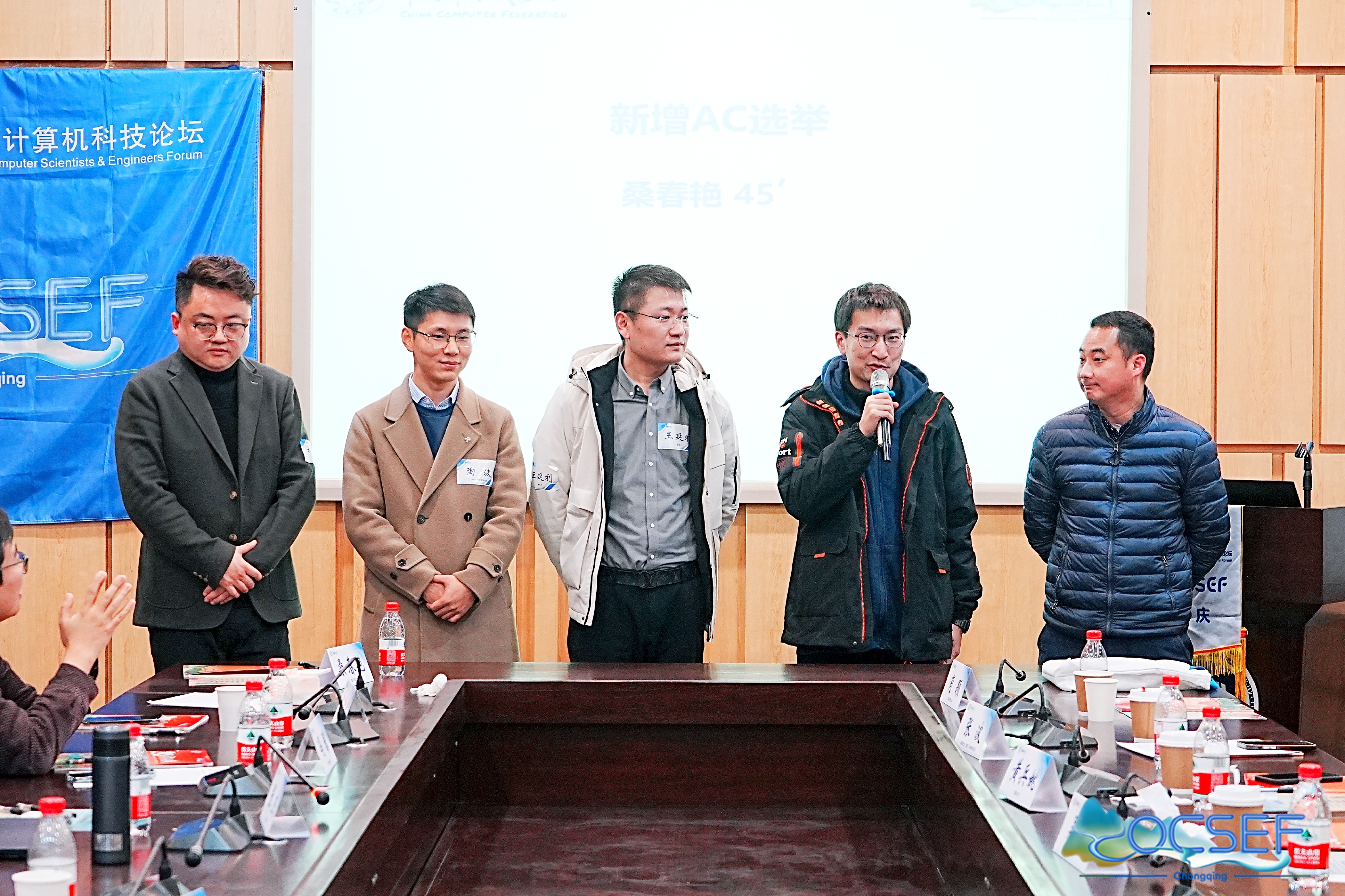 首先是AC委员的增选,本次增选学术AC委员2人,非学术AC委员3人。学术界参选人有重庆三峡学院陈草、中国科学院绿色智能技术研究院陈芋文、西南大学黄俊杰,非学术界参选的人选有浪潮集团甘玲波、浪潮云信息技术股份公司、深信服科技股份有限公司陶波、新华三技术有限公司王延利、西部智数数字科技有限公司杨智涵,经过个人竞选发言、推荐人介绍、现场质询及现任AC委员投票,CCF YOCSEF总部AC鄢兴雨、长沙主席陈果、成都副主席陈磊、西安副主席赵明华、西安候任副主席崔磊、青岛候任副主席刘金环唱票、计票和监票,最终中国科学院绿色智能技术研究院陈芋文、西南大学黄俊杰当选学术候任AC委员,新华三王延利、西部智数杨智涵、深信服陶波当选非学术候任AC委员,新当选的候任AC委员依次发表了当选感言与未来工作设想。
