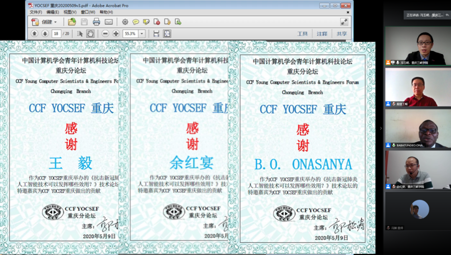 2020年5月9日14:00-17:00,中国计算机学会青年计算机科技论坛重庆分论坛(CCF YOCSEF重庆)在腾讯会议平台(会议号:882 369 740)举办了以“抗击新冠肺炎人工智能技术可以发挥哪些效用?”为题的论坛。