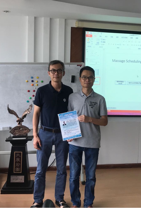 特邀讲者韩鑫报告了流水作业调度问题的近似算法,该问题在生产计划排程中有着重要的应用,并被国内外学者广泛关注。在报告中,重点介绍了近似算法的理论分析结果,并详细讲解了所提出的目前具有最小近似比的算法,且分析了该近似比与理论下界的关系。YOCSEF大连AC委员、大连海事大学副教授高健为韩鑫颁发了感谢奖牌。