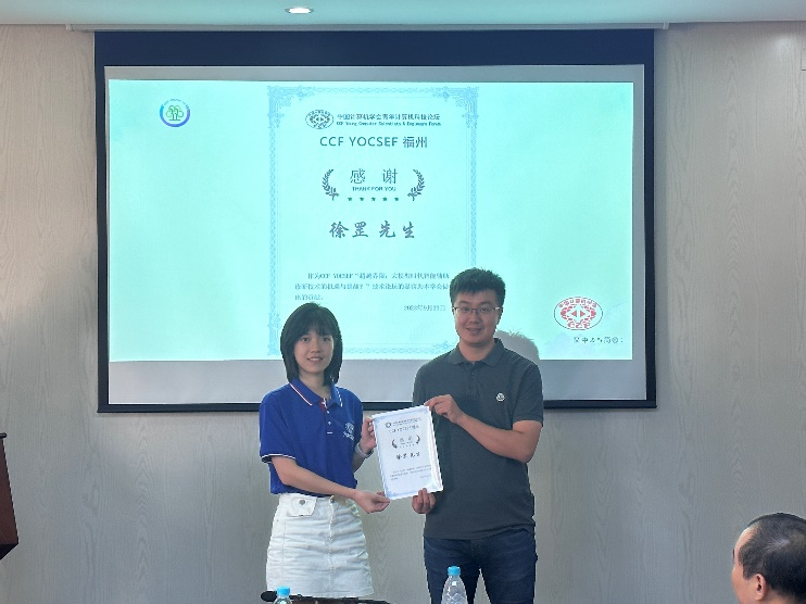 图7 副主席尤玮婧为复旦大学复杂体系多尺度研究院徐罡博士颁发感谢证书
