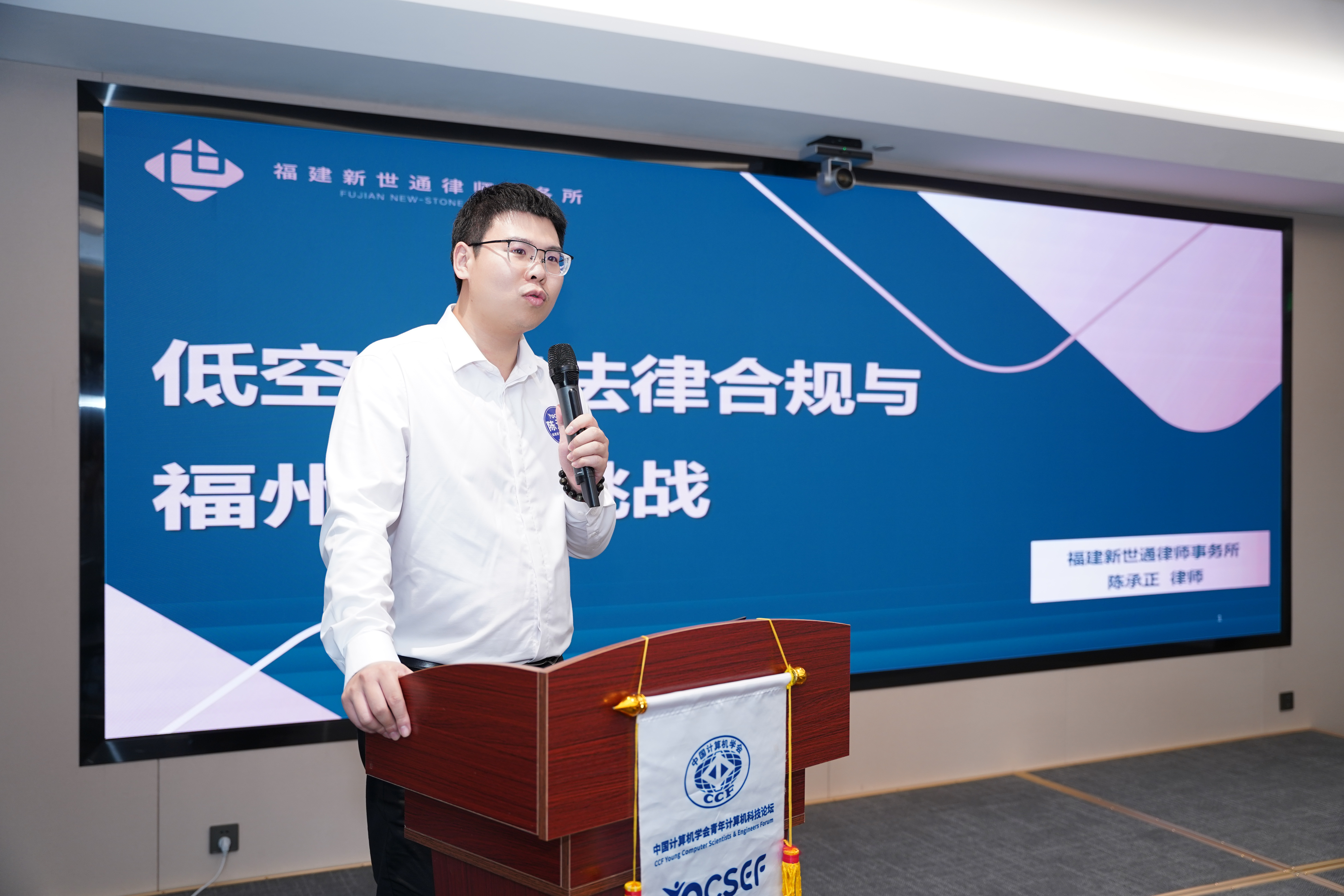 随后,福建新世通律师事务所合伙人、福建省法学会数字法学研究会副会长陈承正以《低空经济法律合规与福州实践挑战》为题,从法律合规视角进行研判。他指出,低空经济仍处于探索期,规则将动态完善,行业底线为适航取证、合规登记、运营合格证与责任保险。陈承正分析了福州“三步走”方案与多点布局的实践,同时直指当前面临的难点:空域审批严、跨部门协同难、基础设施薄弱、标准缺失及“黑飞”执法不严。他建议完善标准与接口、健全联合执法与跨区域通行规则,以法治与数据治理托底,推动产业规范、健康发展。