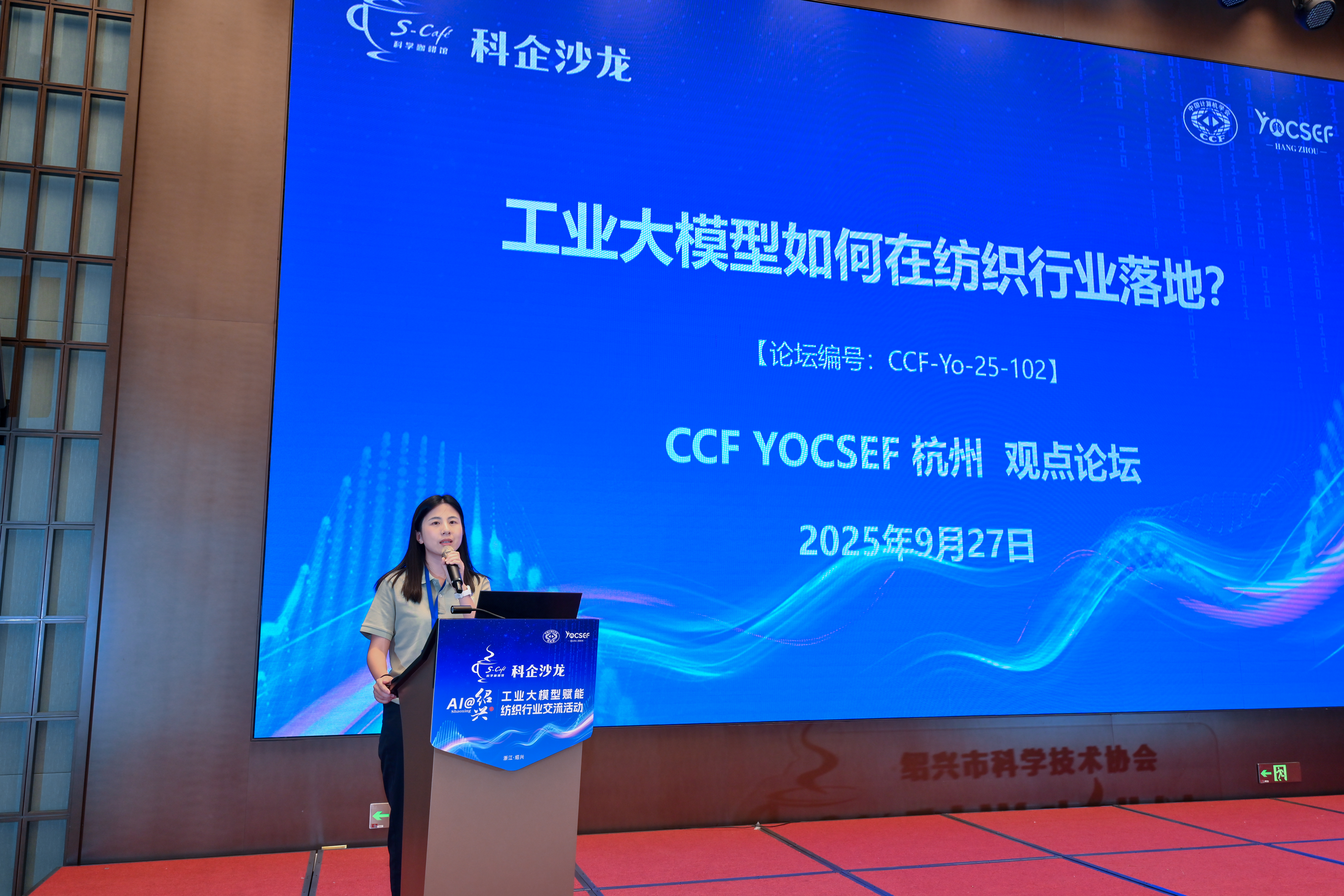 9月27日下午,由中国计算机学会(CCF)主办,中国计算机学会青年计算机科技论坛杭州分论坛(CCF YOCSEF杭州)与绍兴市科学技术协会联合承办的观点论坛 “工业大模型如何在纺织行业落地?”在浙江绍兴举行。此次论坛是绍兴人才周的重要活动之一,同时也是浙江省科学技术协会“科学咖啡馆”品牌活动。此次活动由柯桥区科学技术协会、柯桥区现代纺织产业服务中心、绍兴市现代纺织及生态环境学会、绍兴市纺织工程学会、浙江屹男集团有限公司共同协办。