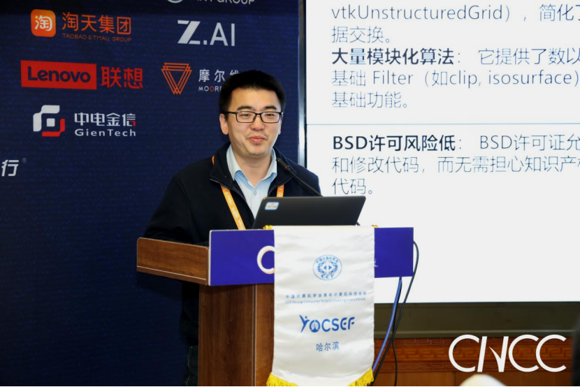 第三位引导发言者是中国人民大学教授汪云海,报告题目为《开源模式赋能工业软件发展思考》,探讨了开源策略是否可以解决工业软件发展困境,特别地VTK为例提出了中国工业软件的发展策略,强调需要高校、科研院所与企业合力构建具有中国特色的独立自主的工业软件及人才培养模式之路