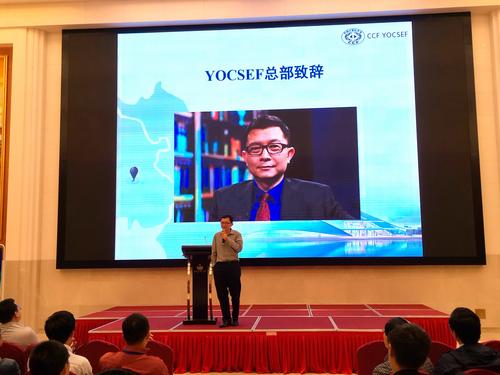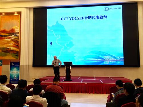 YOCSEF合肥分论坛主席郑利平主持CLUB,代表合肥分论坛诚挚欢迎全国各地的YOCSEF兄弟姐妹。由YOCSEF合肥分论委员带来的改编小合唱《蓝精灵》开场,唱出YOCSEF人的酸甜苦辣、坚持和理想。CCF合肥分会代表陈拥权、YOCSEF总部学术委员会主席谭晓生致辞,重温“承担社会责任、提升成员能力、促进成员合作、探索新的机制”的YOCSEF主旨,祝愿YOCSEF明天更美好。