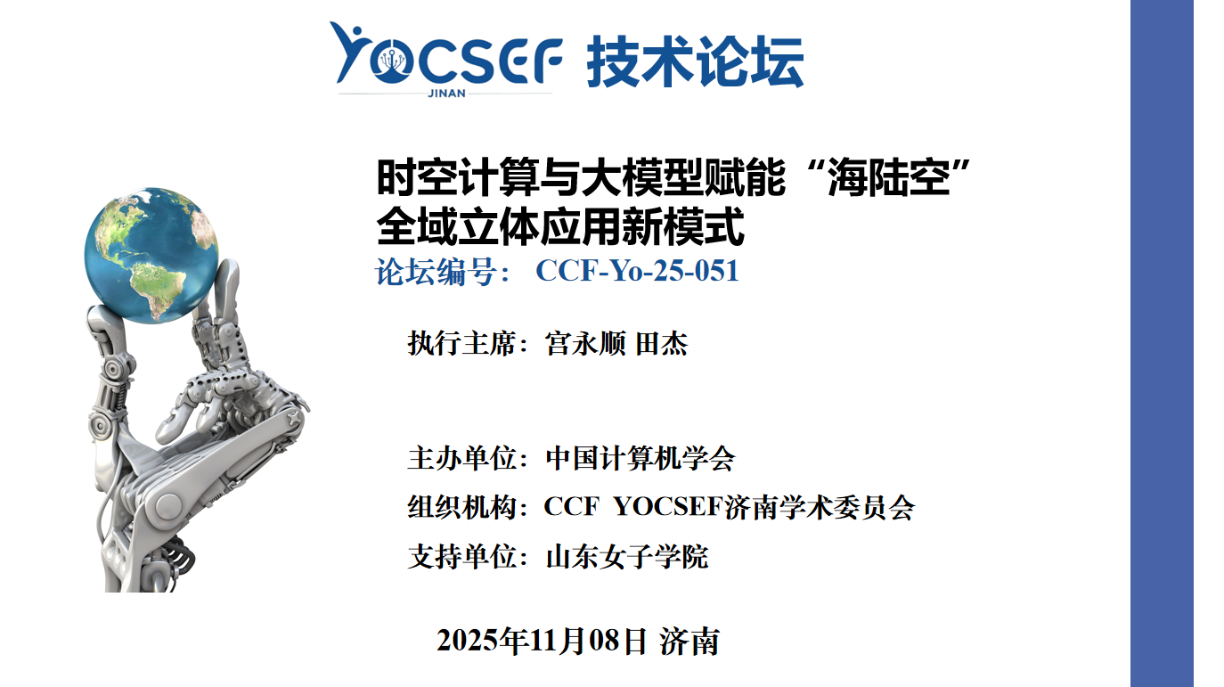 2025年11月8日,CCF YOCSEF 济南学术委员会在山东女子学院举办“时空计算与大模型赋能‘海陆空’全域立体应用新模式”技术论坛。论坛围绕“海陆空”全域立体计算的智能化研究,探讨时空计算与大模型在其中应用的前沿趋势、落地案例和挑战机遇,共同探讨如何通过技术与治理融合,构建在“海陆空”三域的新型智能计算应用模式,探讨未来对出行、生活带来的新模式。