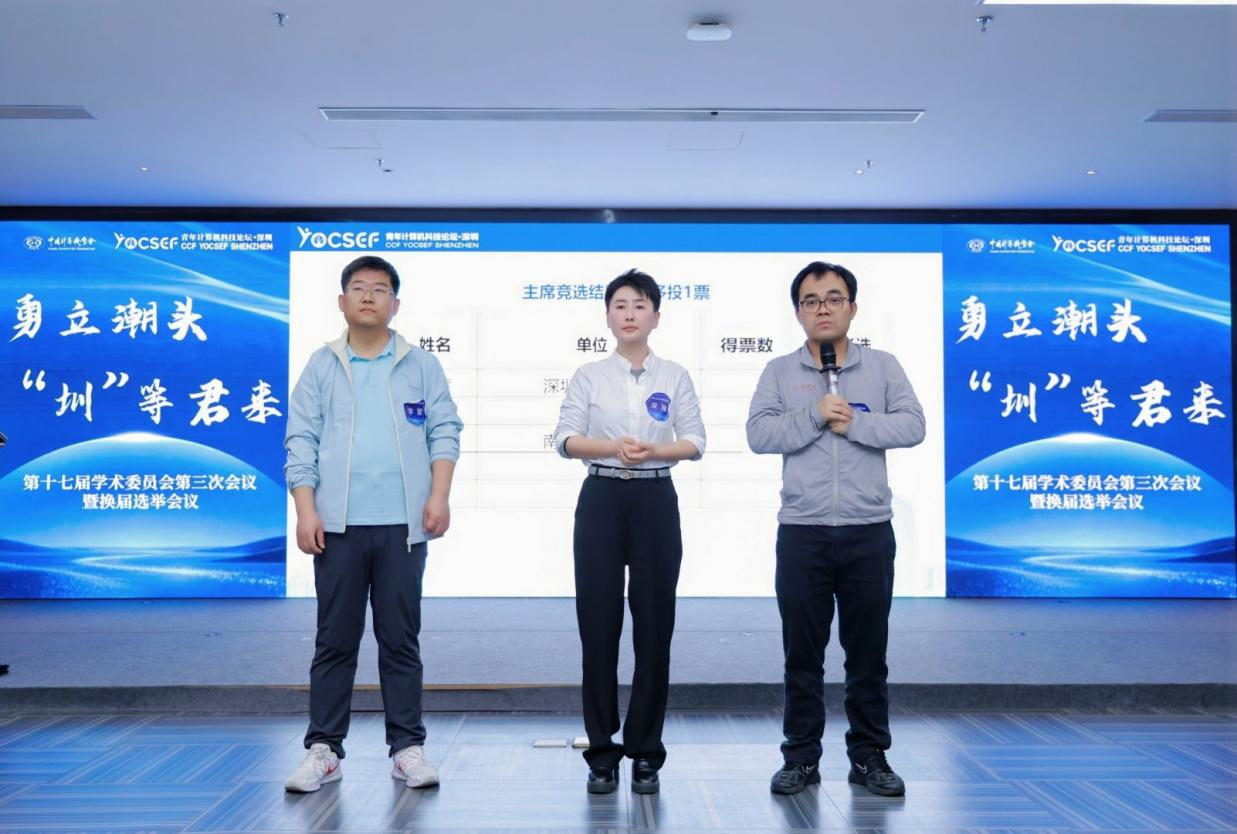 AC副主席竞选环节由张莹主持,张海刚(深圳职业技术大学)、陈科海(哈尔滨工业大学(深圳))、王晶晶(北京大学深圳研究生院)、李卓钊(南方科技大学)4人参与竞选。通过竞选演讲、投票与集体提问环节,张海刚(深圳职业技术大学)、陈科海(哈尔滨工业大学(深圳))、李卓钊(南方科技大学)当选为2026-2027年度CCF YOCSEF深圳候任AC副主席。