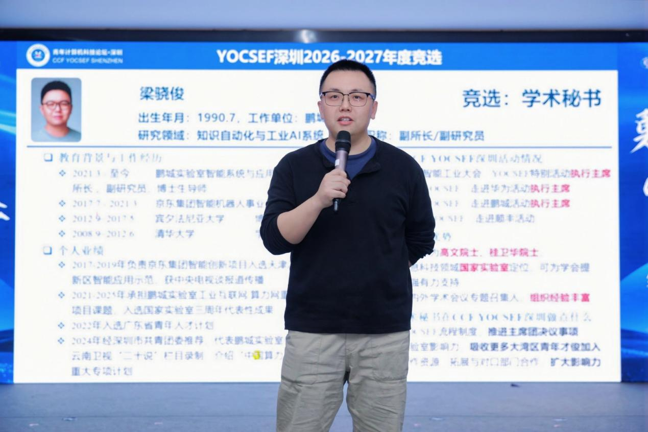 学术秘书选举换届由张莹主持,梁骁俊(鹏城实验室)、刘文万(中科曙光)、段海涵(深圳北理莫斯科大学)、白瑞(锐软科技(深圳)有限公司)参与了竞选。4人分别述了各自的经历、优势和工作设想,经过集体提问与投票,梁骁俊(鹏城实验室)、段海涵(深圳北理莫斯科大学)当选为2026-2027年度CCF YOCSEF深圳学术委员会候任AC学术秘书。