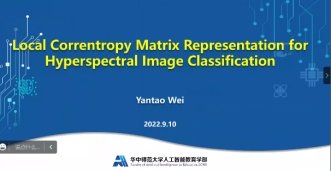 论坛的引导发言环节邀请了3位嘉宾,分别是:华中师范大学副教授魏艳涛、合肥工业大学副教授李畅以及江汉大学副教授赖重远。作为湖北省教育信息化研究中心(省重点实验室)副主任,魏艳涛副教授带来了题为“Local Correntropy Matrix Representation for Hyperspectral Image Classification”(基于局部相关熵矩阵表示的高光谱图像分类)的引导发言。魏艳涛副教授首先介绍了高光谱图像分类研究的现状。高光谱图像是一种特殊的图像数据,是通过高光谱传感器采集的包含有多种光谱谱带的图像数据信息,常见于卫星遥感图像数据分析。与传统图像数据相比,高光谱图像包含有更为丰富的光谱信息和更强的区分度。当前高光谱图像分类面临训练数据量少、数据标记耗时费力,“同谱异物与异物同谱”现象严重等难点。魏艳涛副教授提出可以通过挖掘不同光谱谱段数据之间的非线性相关性来获取有价值的信息。通过利用核方法来对不同谱段信息之间的非线性相关性进行学习,并利用相关熵来估计和表示,提出了局部相关熵矩阵表示方法。在协同感知应用中,不同传感器获取的信息同样具有相关性。如何有效地利用不同传感器数据的相关性信息,并利用上述信息解决传感器感知偏差,以及不同传感器感知的冲突和异常值得探讨。该项研究为协同感知领域相关研究提出了新的思路。