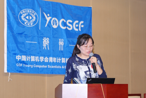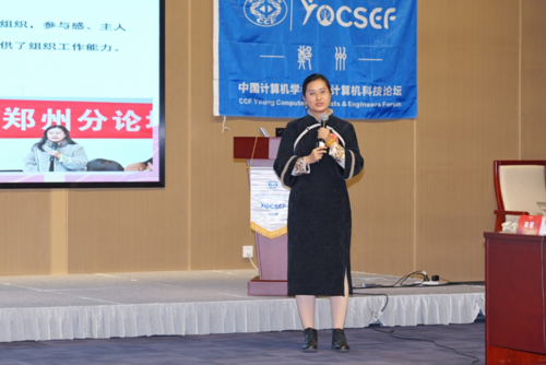 随后,CCF YOCSEF郑州主席陆丽作题为“追光逐梦”的年度工作总结。她回顾了郑州分论坛在第二十一届的工作历程中,如何持续发挥平台引领作用,助力青年科技工作者成长,并强调在“廿复一年,风华郑茂”的新起点上,更需“郑待同行”,汇聚众智,开拓更具影响力的学术交流空间。