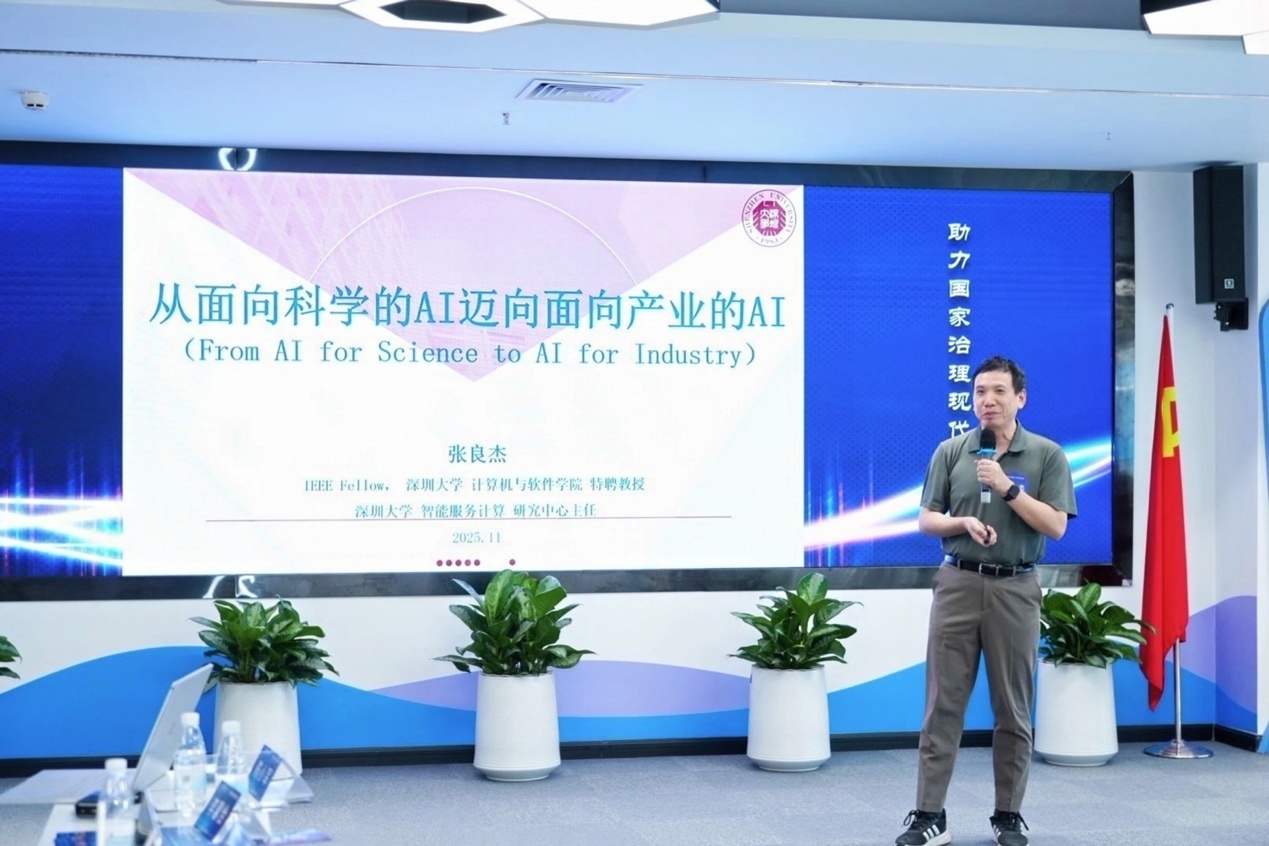 深圳大学计算机与软件学院特聘教授张良杰带来题为《从面向科学的AI迈向面向企业的产业的AI(From AI for Science to AI for Industry)》的报告。张良杰提出面向科学的人工智能(AI for Science)和面向产业的人工智能(AI for Industry),二者并非割裂,可相互推动并形成“探索未知-价值落地-需求反哺”的完整链路。他指出AI for Science以AI算力、推理与生成能力赋能科研,核心是破解未知,技术上侧重复杂建模、理论研究与仿真研究,对精度和泛化性要求高,依赖实验与模拟数据,不强调实时性。AI for Industry聚焦工程化价值,强调全流程智能协同、降本增效,还能以场景数据反哺科研,形成创新闭环。典型案例包括用模糊神经网络设计智能空调控制器、雅诗兰黛集团凭借AI与大数据打造智能零售生态以及特斯拉FSD 14.0凭借AI生成数据训练实现全自动驾驶等。最后,他表示,AI从早年手工调神经网络发展到如今大模型时代,效率大幅提升。未来AI或能设计机器人与控制器,进化为智能劳动力,在“Human Being”的世界中出现“AI being”,这会进一步引发人类与AI共存合作的深度思考。