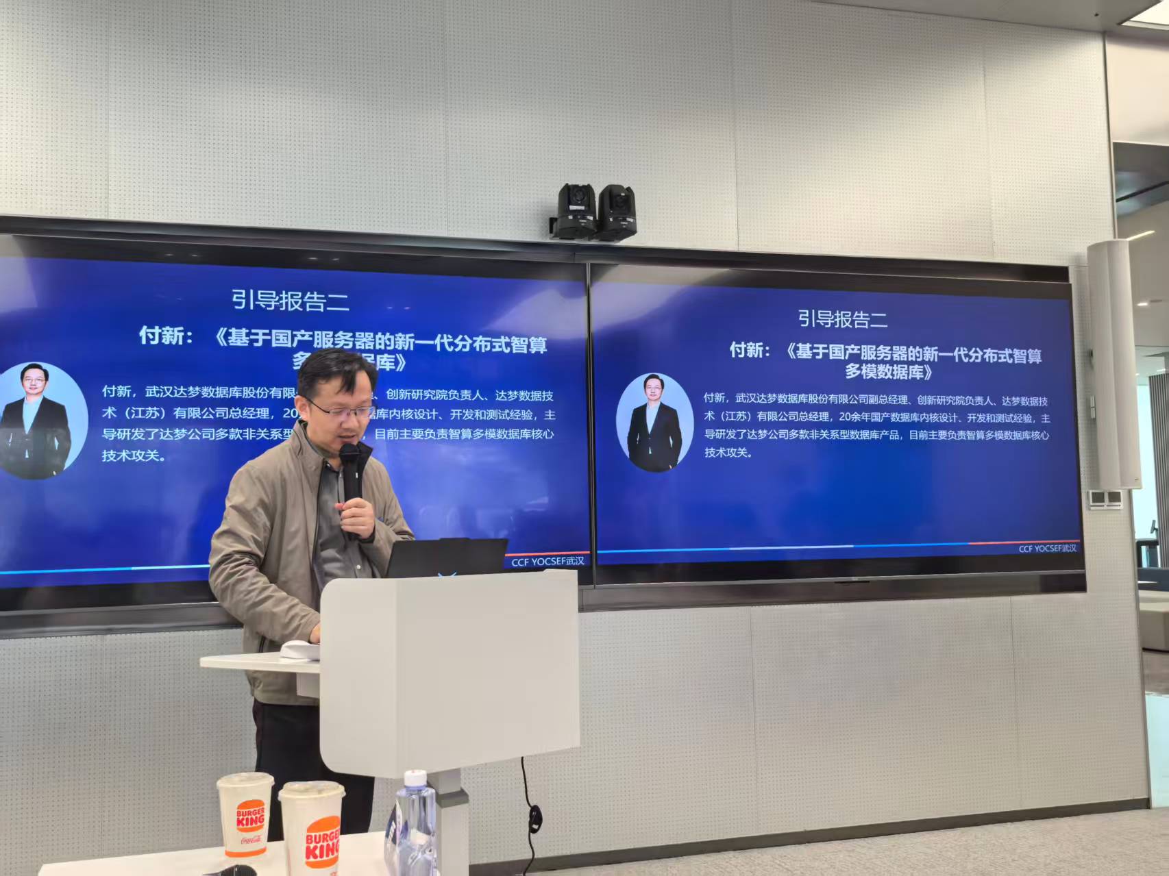 引导发言二来自武汉达梦数据库股份有限公司副总经理、创新研究院负责人、达梦数据技术(江苏)有限公司总经理付新,带来《基于国产服务器的新一代分布式智算多模数据库》,主要内容为:数据智能业务是AI时代的生产元素,新一代的分布式智算多模数据库,在AI原生能力、多模数据管理、一体化架构进行了最新的研究和实现,以更好的对国产软硬件进行匹配。