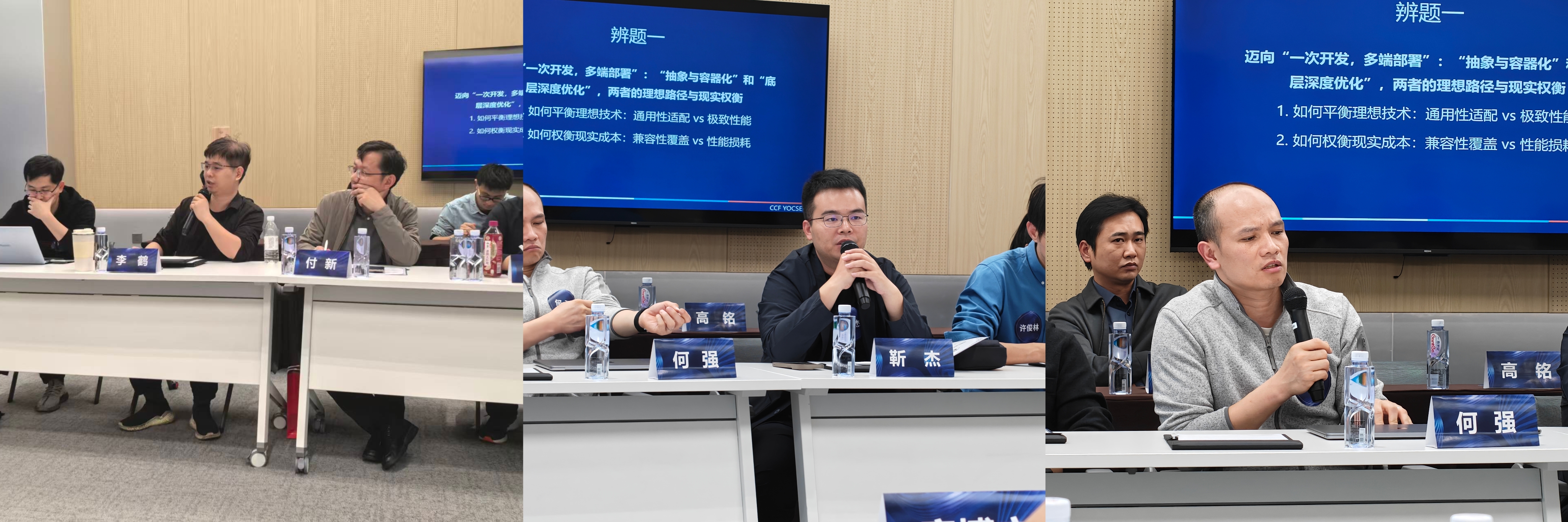 金山云政企事业部专有云产研中心负责人靳杰认为,性能和通用性适配需要分场景进行;武汉大学计算机学院教授江佳伟,针对底层软件,可以通过软硬件优化进行性能优化,上层软件性能优化需在保障业务灵活性与开发效率的前提下,通过代码逻辑优化、资源调度复用、架构分布式调整及编译运行时优化来精准消除瓶颈,平衡通用性适配与极致性能、兼容性覆盖与性能损耗,这与底层软件聚焦硬件利用率的优化路径和权衡焦点不同;金山办公Office产研架构师谢茂培认为,不同的软件,不同的用户的操作习惯各自不同,带来了软件的不同差异,企业和学术界需要协同推荐国产标准化的制定;华为2012实验室鸿蒙突击队WPS及PC应用负责人唐博文指出,抽象与容器化、底层深度优化并非对立关系,而是可通过 “分层架构” 实现协同,核心是 “把抽象层做灵活,把优化点做精准”。李鹤认为,随着用户量的增加,用户的需求也会从初级的能用到好用的变化,市场驱动也是一个在实现平衡理想技术的过程中需要进行考虑的因素。付新认为可以开放应用平台接口由上层用户来进行测试,来平衡通用和性能的问题。华中科技大学计算机学院教授何强指出,边缘人工智能中的一次开发多端部署,这里的端指的是不同的终端设备,研究了基于WASM平台来进行多端的部署,但是研究中仍然发现,在实现中通用性和兼容性提升的同时,不可避免的都带来了性能上的欠缺。