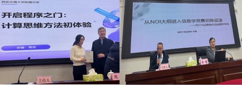 中国计算机学会两位顶尖信息学教育专家周杰(西安交通大学附属中学金牌教练)、李曙(南京外国语学校国际金牌教练)分别以《开启程序之门:计算思维方法初体验》和《从NOI大纲进入信息学竞赛训练征途》为题,为桐华学校200余名师生进行专题讲座,生动有趣、深入浅出地介绍了计算思维的基本概念和信息学竞赛的学习路径,在桐华学子心中播下探索计算机科学的种子。