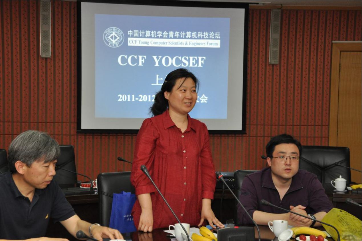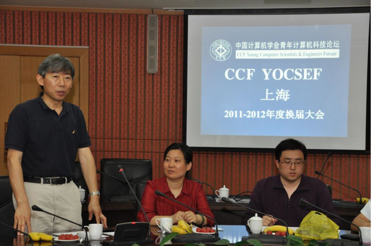CCF YOCSEF上海2011-2012年度换届大会于2011年5月21日下午14:30-17:30在 上海市南昌路59号科学会堂思南楼1001室隆重举行。参加会议的嘉宾有:复旦大学计算科学技术学院副院长、CCF YOCSE上海荣誉委员向阳教授、上海交通大学计算机系吕宝粮教授、上海市计算机学会张敏琦女士、上海电信市场部副总经理王晓峰女士、东方网诚信在线主编张一鸣、《上海计算机》执行主编江正;到会的荣誉委员有陈榕、王新、广涛、录金、晓亮、路红;到会的AC委员有笑菊、骄雄、志军、比布、周文、王漫、未未、文强、彦鹏、俊杰、周裕、冬冬(张)、冬冬(李);参加会议的还包括委员及社会人士共14名。