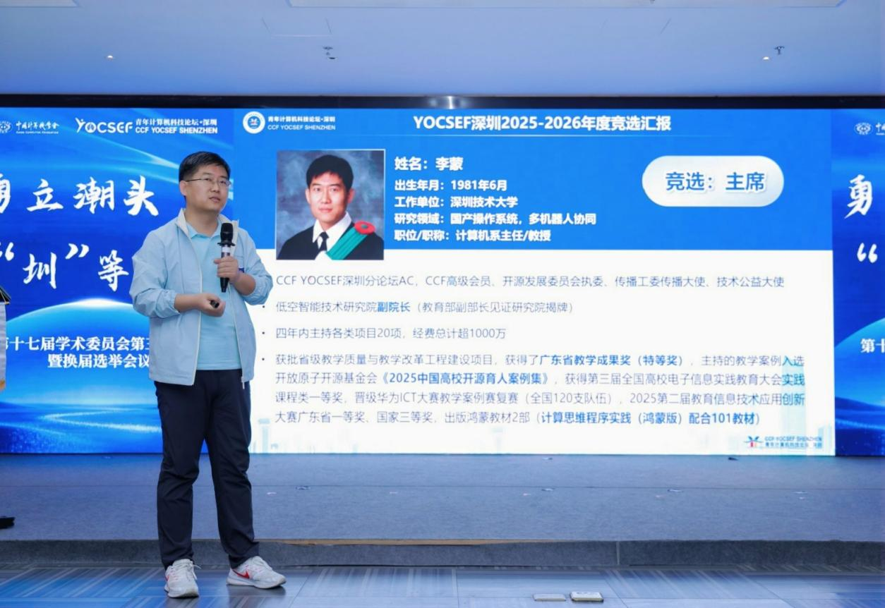 最受关注的AC主席竞选环节由张莹主持,经提前报名和现场报名,李蒙(深圳技术大学)、梁臻(深圳大学)、李卓钊(南方科技大学)3人参与了主席的竞选。他们分别阐述了各自的经历、优势和未来工作设想与改进措施。四位参选者接受了历任主席、优秀AC委员、现任AC委员和现场参会人员的轮番提问后,经到场现任AC委员无记名投票,李蒙(深圳技术大学)当选为2026-2027年度CCF YOCSEF深圳候任AC主席。