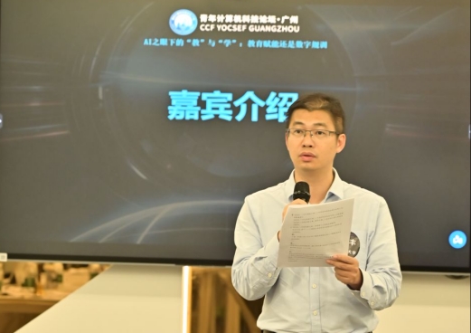 本次论坛由CCF主办,YOCSEF广州学术委员会组织,广东工业大学计算机学院和广州唐邦信息科技有限公司联合支持。YOCSEF广州副主席朱鉴(广东工业大学)和AC委员、候任副主席陈炳丰(广东工业大学)担任本次论坛执行主席。论坛邀请了暨南大学官全龙教授、华南师范大学詹泽慧教授、香港教育大学孙丹儿副教授担任引导嘉宾,上海大学岳晓冬教授、南京邮电大学张珺教授、广州青鹿教育科技有限公司廖力副总经理担任思辨嘉宾。广东工业大学计算机学院院长李小平教授,CCF广州分部秘书长吴一冰(YOCSEF广州2021-2022主席),广东工业大学谭台哲(YOCSEF广州2014-2015主席)、中山大学李冠彬(YOCSEF广州2024-2025主席),往届副主席高静(广东恒电信息科技股份有限公司)、孙为军(广东工业大学),荣誉AC刘雷(广东科技报社),YOCSEF广州现任主席苏申(广州大学)、现任副主席姜思羽(广东外语外贸大学)、陈俊颖(华南理工大学),现任学术秘书李雯霖(广东财经大学),AC委员黄培涛(广州唐邦信息科技有限公司)、崔金荣(华南农业大学)、张帆(云米)、李宇翔(头歌平台),候任AC委员邱少健(华南农业大学)、胡宇(广东工业大学),以及陈薇(广东工业大学)、王甜甜(北京优诺UINO)、王映梅(广州唐邦信息科技有限公司)、潘俊修(广州恒联)等来自多家单位的40余位代表参与论坛。
