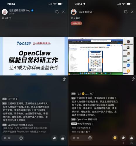 本次线上Club通过创新性的"线上会议+公众号直播"形式,突破地域限制,覆盖更广泛的受众群体。观众积极参与互动,就OpenClaw的安装配置、科研场景应用等问题展开热烈讨论。本次活动也得到了北京超级云计算中心的大力支持。