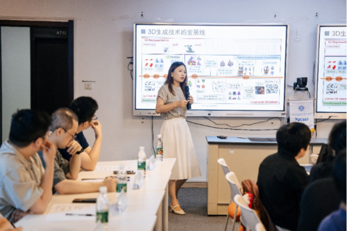 中国科学技术大学陈雪锦做了题为《三维表征的未来:统一还是多样?》的引导报告。她首先从传统计算机图形学的角度回顾了三维表征技术发展脉络。然后,重点阐述了基于显式几何表达与运动表达相关的研究进展,包括自监督物体表面网格重建和基于层级结构的动态场景神经渲染,并从三维表征的显示、传输、编辑与生成等角度出发对统一表示与多样表示两种技术路径进行了对比分析。