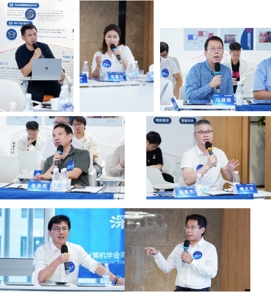 北京理工大学(珠海)助理教授高荣贞、鹏城实验室副研究员梁骁俊、中泓在线副总裁罗君、香港科技大学助理教授袁彬航、北京理工大学(珠海)助理教授陈家贤、北京理工大学(珠海)助理教授周本加以及腾讯科技高级经理张伟鹏作为特邀嘉宾对三个思辨议题进行了引导发言,分别从AI时代下的基础学科科研人员价值重定位、校企协同的研究生态构建方式变化以及高等教育人才培养方案优化等方面发表了自己的独特见解。