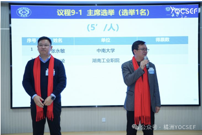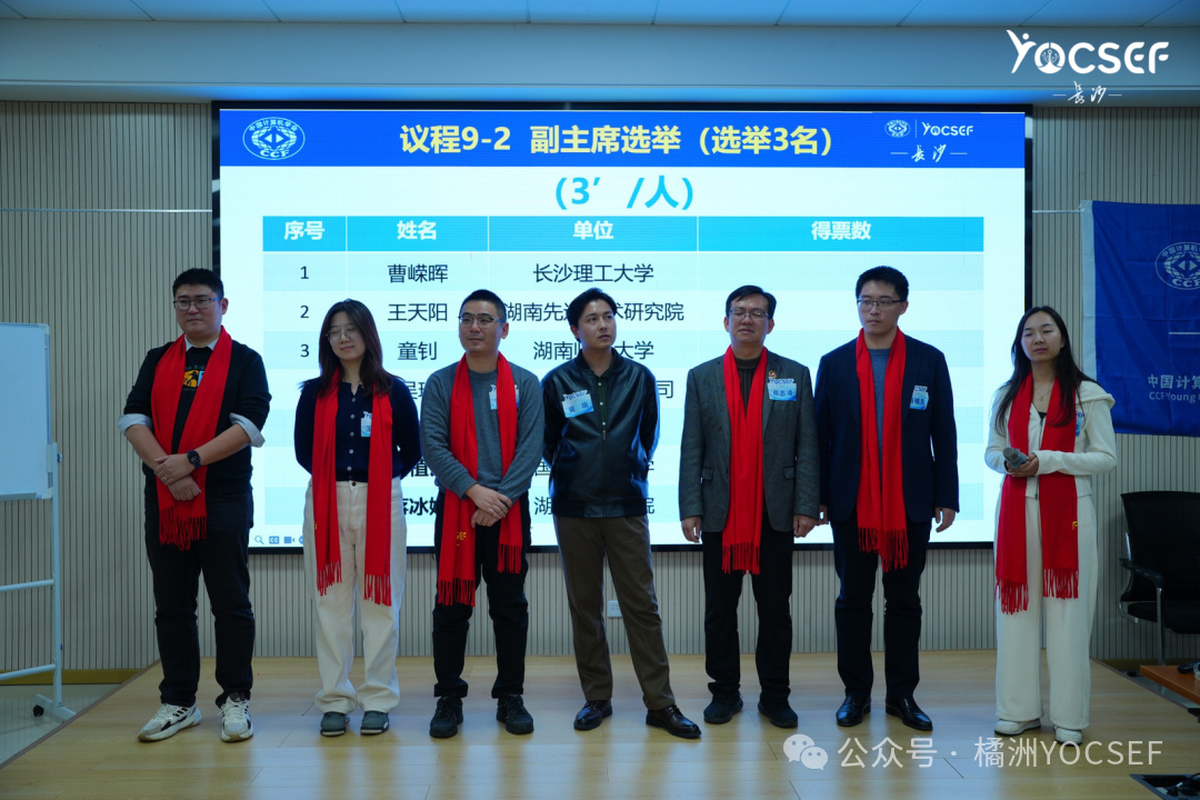 整个会议最受关注的环节是主席会议成员的竞选。经提前报名和现场报名,张永敏(中南大学)、郑志凌(湖南工业职院)参与了候任主席的竞选。两位候选人重点阐述其在YOCSEF的过往经历,对所竞选职位的职责认知、未来发展理念、具体工作计划以及对分论坛中长期发展的战略思考。随后,候选人接受了总部AC委员、分论坛AC委员和现场参会人员的轮番提问。经现任AC委员无记名投票,张永敏当选为CCF YOCSEF长沙学术委员会2026-2027年度候任主席。接下来是副主席及学术秘书的竞选,同样精彩纷呈,氛围热烈。整个竞选过程中,所有候选人就整体规划、协同合作进行演进,并回答了现场提问。同样遵循严谨的无记名投票程序,依次选举产生候任副主席、候任学术秘书。过程紧张有序,结果凝聚了委员会的集体选择与信任。历经多轮投票后,曹嵘晖(长沙理工大学)、童钊(湖南师范大学)、王天阳(湖南先进技术研究院)当选CCF YOCSEF长沙学术委员会2026-2027年度候任副主席。吴瑞(深信服科技股份有限公司)、田植良(国防科技大学)当选CCF YOCSEF长沙学术委员会2026-2027年度候任学术秘书。选举结果揭晓后,新当选的主席会议成员全体上台,张永敏代表发言。他强调将继承YOCSEF长沙的优良传统,紧密围绕“承担社会责任、提升成员能力”的宗旨,在巩固现有品牌活动优势的基础上,着力在推动跨学科前沿探讨、加强产学研深度融合、提升青年委员领导力、扩大分论坛区域影响力等方面寻求突破。