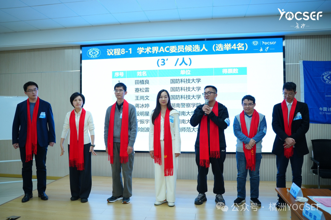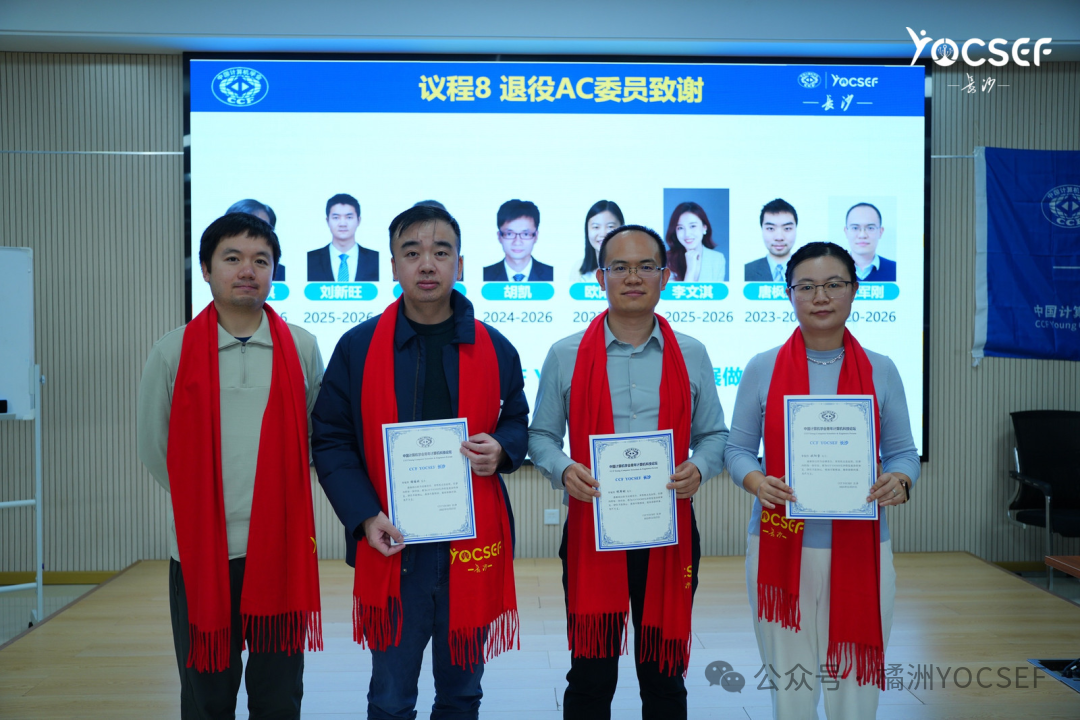 茶歇结束,会议进入充满温情的AC退役环节。现任主席纪军刚代表长沙分论坛,向八位任期届满的AC委员致以最诚挚的谢意,高度评价了他们在任期内为分论坛发展所倾注的心血与智慧。随后,退役委员代表谢国琪、欧阳雪及纪军刚分别发表感言。他们深情回顾了在YOCSEF的奋斗历程,一致认为这段经历是职业生涯中不可磨灭的宝贵财富。他们承诺,“退役不褪色”,未来将以新的身份继续关注和支持分论坛的建设。为表彰其卓越贡献,总部AC委员邸欣晨代表CCF YOCSEF总部逐一颁发荣誉证书,全场以热烈的掌声向这些奉献者致以崇高敬意。接下来,新一届选举程序随即启动。首先进行的是候任AC委员的增选,现任主席纪军刚主持,此环节旨在为分论坛补充新生力量。每位候选人均进行了限时竞选演讲,阐述自身专业背景、对YOCSEF文化的理解、既往参与情况以及若能当选后的工作设想。每位候选人演讲后,由其推荐人陈述推荐理由,具体说明该候选人的独特价值、潜在贡献以及与YOCSEF精神的契合度。随后,候选人进行现场答辩,现场氛围讨论热烈,洋溢着对分论坛未来的无限畅想。问答结束后,由具有投票权的现任AC委员进行无记名投票。两轮投票分别产生了新一届学术界候任AC委员与非学术界候任AC委员。整个过程公开透明,计票严谨。此次竞选激烈,7名候选人竞选4个学术界候任AC委员名额,4名候选人竞选2个非学术界候任AC委员名额。经过差额竞选和无记名投票,田植良(国防科技大学)、蹇松雷(国防科技大学)、蒋冰婷(湖南警察学院)、段明星(湖南大学)当选为学术界候任AC委员;高彩丽(湖南湘讯未来科技有限公司)、郭泰彪(云边智算科技有限公司)当选为非学术界候任AC委员。